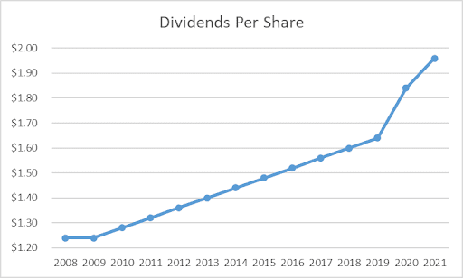 The payout ratio has decreased over the past decade, from 83% in 2008 to 28% in 2020. A lower payout ratio should provide a better margin of safety from short-term turbulence in earnings per share. It can also provide additional fuel behind future dividend increases. This can result in dividend growth that is faster than earnings growth for a period of time.