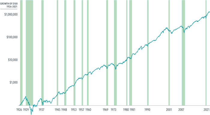 A hypothetical $100 investment in the securities in the Fama/French US Total Market Research Index, a value-weighed U.S. market index, from July 1926 through December 2021. Recessions shaded in green.